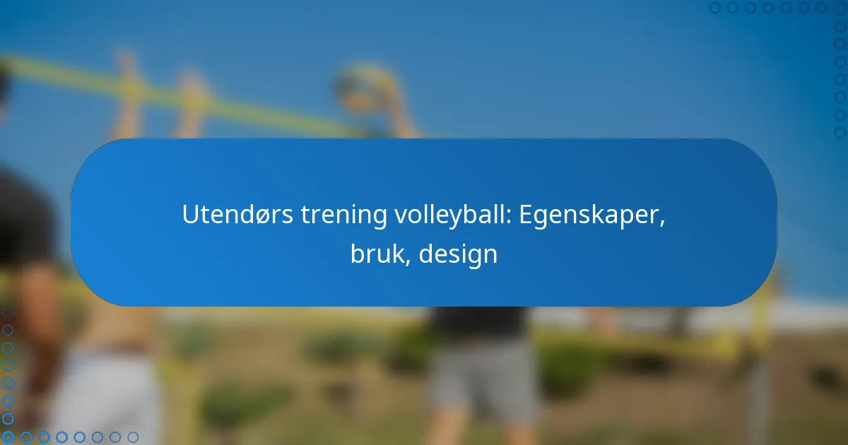 Utendørs treningsvolleyballer er designet med spesifikke egenskaper som forbedrer ytelse og holdbarhet under ulike værforhold. Nøkkelaspekter inkluderer materialkomposisjon, størrelse og vektspesifikasjoner, grepsegenskaper, ytelsesteknologier og værmotstand.